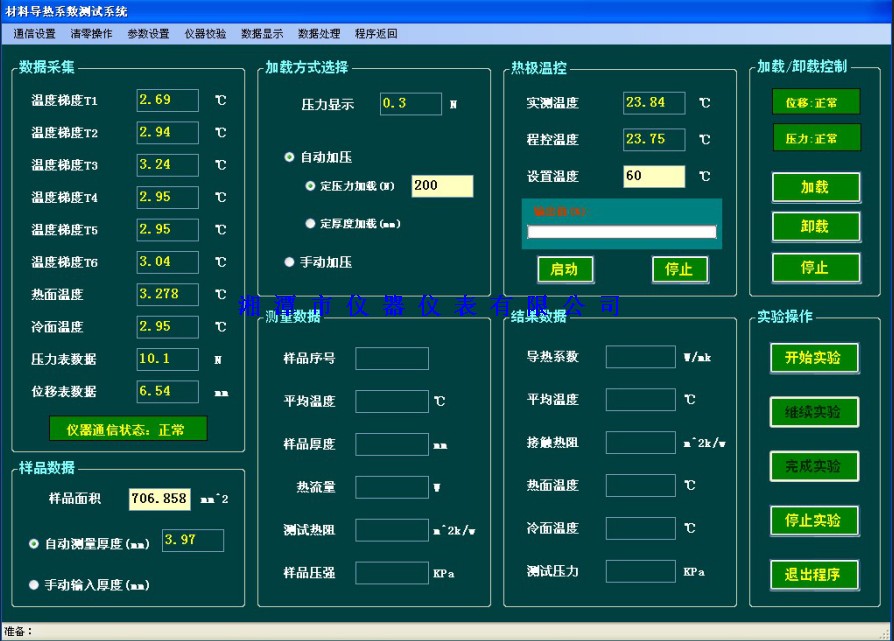 儀器特點(diǎn):帶自動(dòng)加壓(配用減速電機(jī)、高精度壓力傳感器、調(diào)速器),自動(dòng)測(cè)厚裝置(配用高精度位移傳感器測(cè)量),并連計(jì)算機(jī)實(shí)現(xiàn)全自動(dòng)控制。儀器采用6點(diǎn)溫度梯度檢測(cè),提高了測(cè)試精度??蓹z測(cè)不同壓力下熱阻曲線,采用優(yōu)化的數(shù)學(xué)模型,可測(cè)量材料導(dǎo)熱系數(shù)和熱阻以及界面處接觸熱阻等多個(gè)參數(shù)。